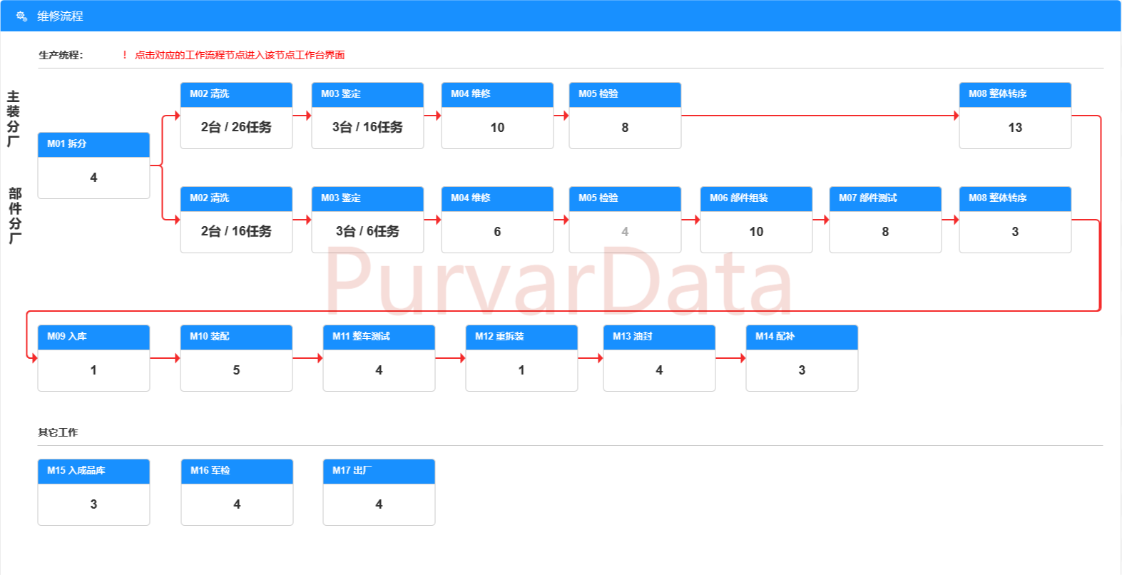 从维修任务计划下达、15个工段,100+工序工卡的执行情况、维修过程中的记录、质量管理及监控管理,实现整个流程的集成化管理。