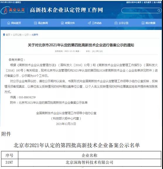 2022新年的钟声即将敲响,在这辞旧迎新之际,公司也喜迎佳音,在全国高新技术企业认定管理工作领导小组办公室公示的北京市2021年认定的高新技术企业名单中,北京深海智科技术有限公司(以下简称“深海智科”)荣登榜单,顺利通过国家高新技术企业认定。