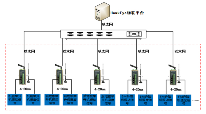 物联网发展至今,已经在各行各业中得到了实际的运用,将来万物互联必将成为现实。某汽车生产车间内输送线体上已安装升降机、提升机、举升机等大型机电设备,设备运行时,是靠电机的运转来驱动设备动作,所以电机的正常运转与否是影响机电设备的重要条件,电机的温度、振动数据又是直接影响电机的参数指标。在此项目中主要采集了电机轴承的振动数据和电机壳体的温度数据。通过远程监测分析温振数据,达到电机故障预测预警的目的。